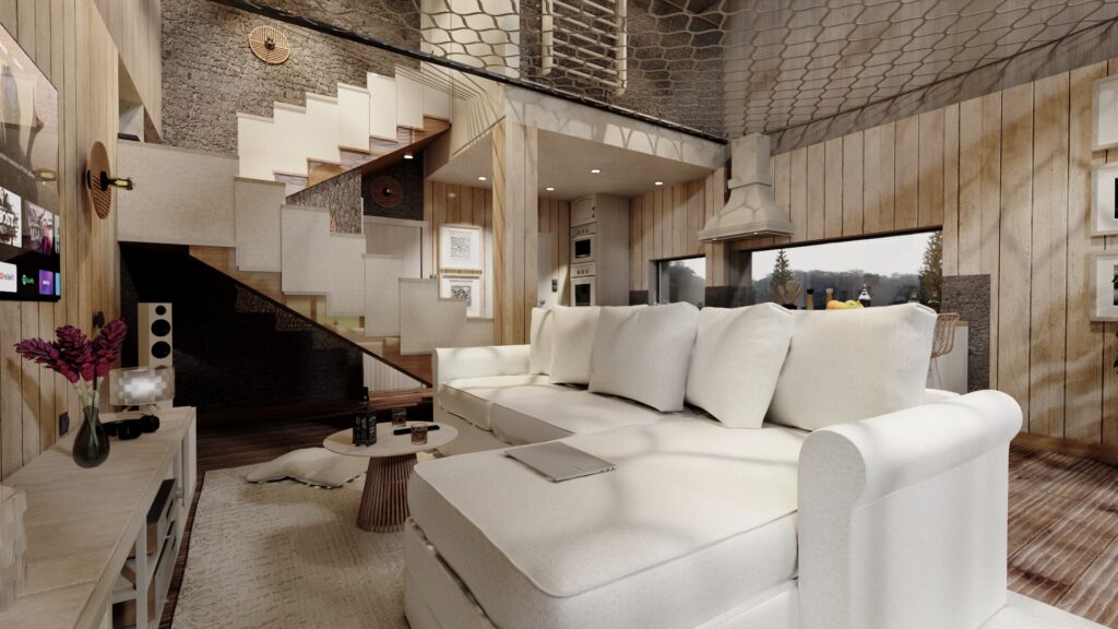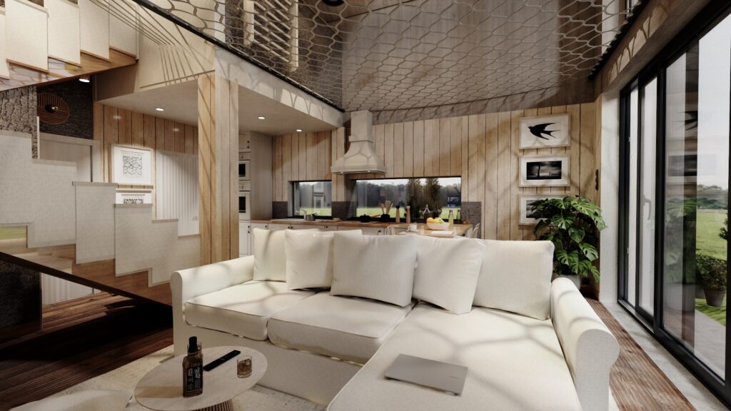 Przedstawiamy wnętrze salonu z otwartą kuchnia w wiejskim domu wtopiony w uroki natury. Zastosowanie dużych przeszklonych ścian z widokiem na jezioro oraz wysokie wnętrze tworzy niepowtarzalny klimat obcowania z natura przez cały rok.